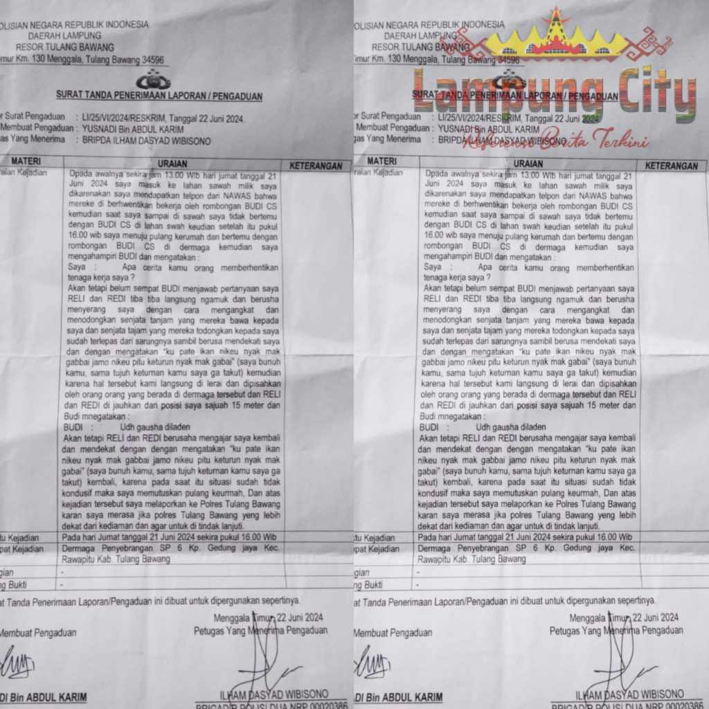 Lambannya Penanganan Aduan Laporan Yusnadi Warga Gedung Meneng di Polres Tulang Bawang di Pertanyakan